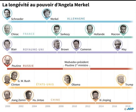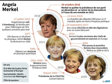 De l'autre, le millionnaire Friedrich Merz, 63 ans, tenant d'un virage à droite du parti et du pays. Autrefois mis sur la touche par Mme Merkel, il fait son retour dans le sérail après une décennie de traversée du désert. Le jeune ministre de la Santé Jens Spahn, un autre anti-Merkel, est jugé hors course. À la tête de la première économie européenne depuis 13 ans, celle que l'opinion surnommait affectueusement "Mutti" (Maman) au temps de sa gloire a été contrainte en octobre, après deux élections régionales très décevantes, d'annoncer qu'elle céderait les rênes du parti.