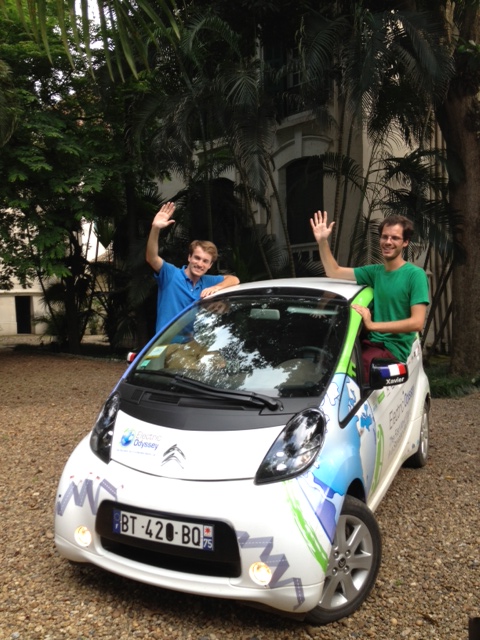 | Les deux jeunes français promeuvent l’utilisation de la voiture électrique dans le monde. Photo : Vân Anh/CVN |