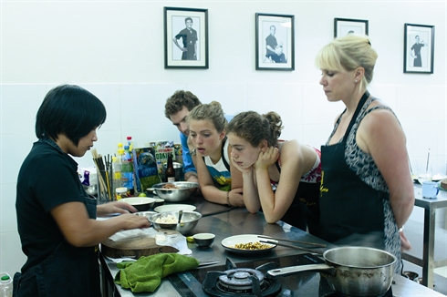 Finies les emplettes, place à la cuisine. Au menu, «Les spécialités hanoïennes». Cette fois, Mme Duyên délaisse son costume de guide pour le tablier de chef cuisinier. Premier exercice, apprivoiser les grands classiques de la cuisine hanoïenne : rouleau de printemps, salade à la fleur de bananier (sans goût de banane, chose assez surprenante) et porc au caramel. Très vite, les apprentis-cuisiniers se familiarisent avec ces plats. Puis, vient le meilleur moment : les touristes sont confortablement installés dans le restaurant à l’étage pour déguster le fruit de leur travail. Entre temps, ils s’amusent à goûter le nhông (pupe de ver à soie) pour un snack…