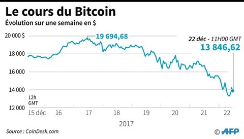 La plus célèbre des cryptomonnaies cotait vendredi 22 décembre vers 18h15 GMT autour de 12.840 dollars, selon les données compilées par l'agence Bloomberg, alors que lundi 18 décembre elle semblait encore toute proche de toucher les 20.000 dollars.