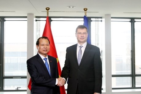 | Le vice-Premier ministre Vu Van Ninh (gauche) et le vice-président de la Commission européenne Valdis Dombrovskis. |