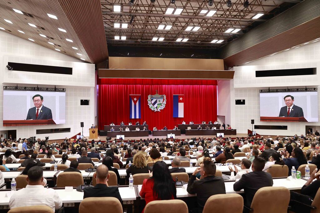| Le président de l’AN du Vietnam, Vuong Dinh Huê, devant l’AN du pouvoir populaire de Cuba, le 19 avril à La Havane. |