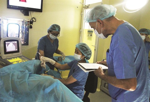 | Un expert venu des États-Unis est formé à la technique de prélèvement des ovocytes sous le guide de Mme Lan (centre). |