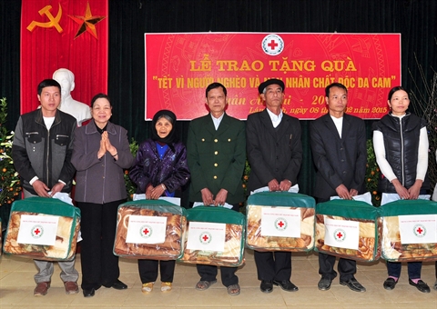 | La chef de la Commission de sensibilisation des masses du CC du PCV, Hà Thi Khiêt (2e, gauche), offre des cadeaux à des personnes démunies et victimes de l’agent orange vivant dans la province de Tuyên Quang (Nord). |