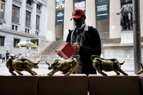 | Un vendeur de répliques du célèbre taureau de Wall Street. |