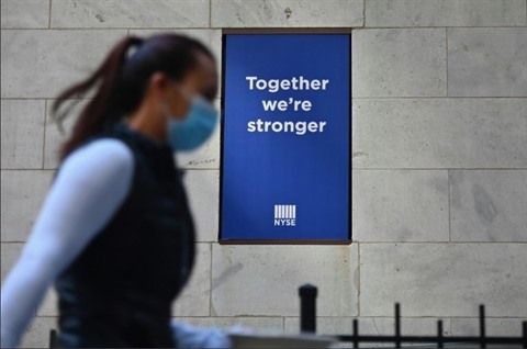 | Une passante devant le New York Stock Exchange à Manhattan (New York), le 5 octobre 2020. |