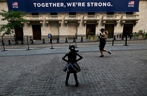 | Des passants déambulent devant le New York Stock Exchange (NYSE) à Wall Street (New York), le 13 juillet. |