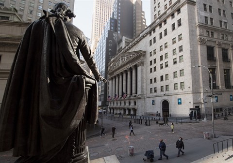 | Une statue de George Washington devant le New York Stock Exchange (NYSE) à Wall Streeet (New York), le 23 mars. |