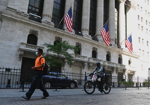 | Des passsants devant le New York Stock Exchange à Wall Street (New York), le 3 août. |