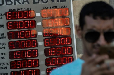 | Un panneau d'affichage des taux de change à Istanbul, le 13 août. |
