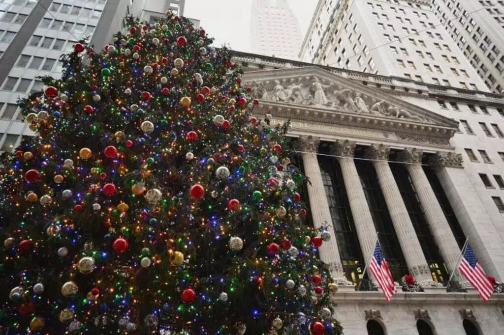 | Un arbre de Noël devant le New York Stock Exchange. |