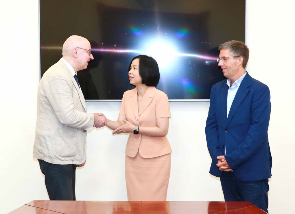 | La directrice générale de l'Agence Vietnamienne d'Information, Vu Viêt Trang, accueille les représentants de la Délégation générale Wallonie-Bruxelles au Vietnam, le 28 août 2023 à Hanoï. |