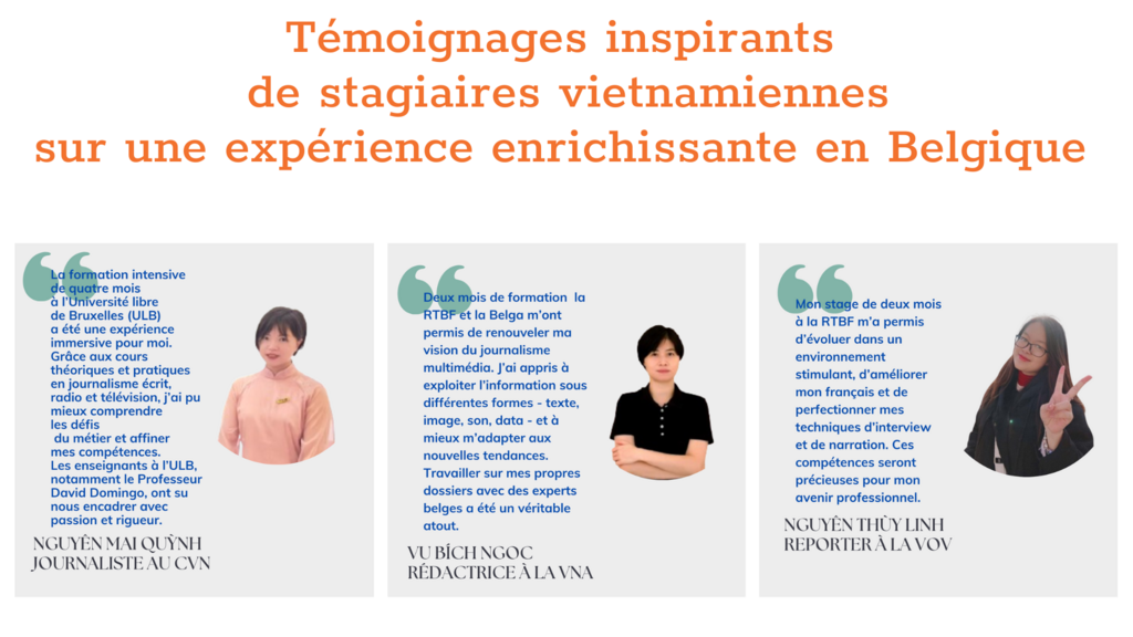 Dans les faits, 12 journalistes francophones de la VNA ont bénéficié de stages à la Radio-télévision belge de la Fédération Wallonie-Bruxelles (RTBF) et à l’Agence de presse Belga, ainsi que de formations intensives en information et communication à l’Université libre de Bruxelles (ULB). De 2022 à 2024, la RTBF a également accueilli six stagiaires de la radio nationale La Voix du Vietnam (VOV).