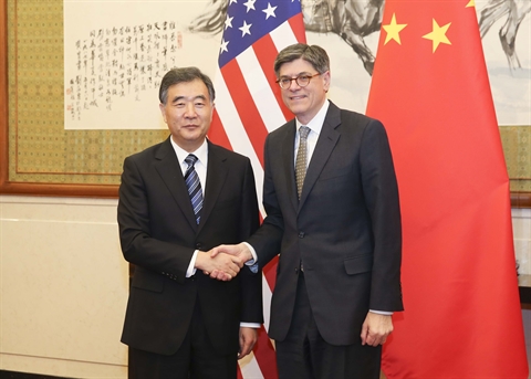 | Wang Yang (gauche) et Jacob Lew, le 28 février à Pékin. |