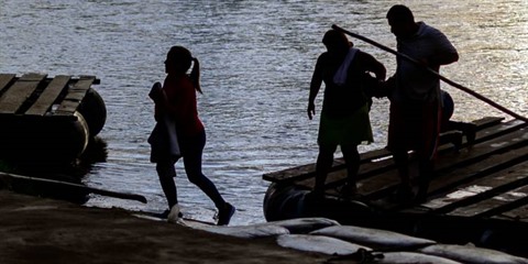 | Traversée en radeau de fortune du fleuve Suchiate, entre Tacun Uman, au Guatemala et Ciudad Hidalgo, dans le Sud du Mexique, le 8 juin. |