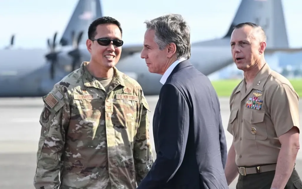 | Le secrétaire d'État américain Antony Blinken a entamé une visite de deux jours à la base aérienne de Yokota à Fussa, à l'ouest de Tokyo. |