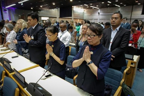 | Photographie fournie par le Programme des Nations unies pour l'environnement (PNUE) montrant les participants à la conférence annuelle de cet organisme en train d'observer une minute de silence, le 11 mars à Nairobi, à la mémoire des victimes du crash d'un avion d'Ethiopian Airlines la veille. |