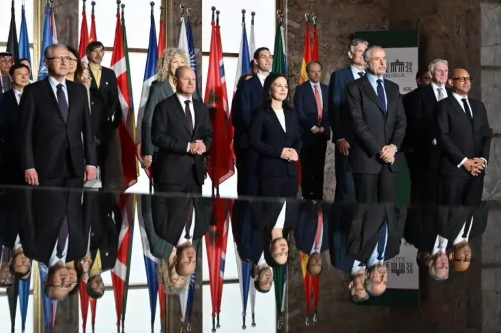 | Photo de famille des participants au dialogue de Pertersberg sur le climat à Berlin le 26 mars, parmi lesquels figurent au premier plan la ministre allemande des Affaires étrangères, Annalena Baerbock (centre), et le chancelier Olaf Scholz (2e à gauche). |