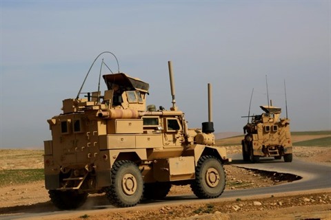 | Un véhicule blindé de fabrication américaine sur une route au nord de la ville syrienne de Raqa, le 27 mars. |