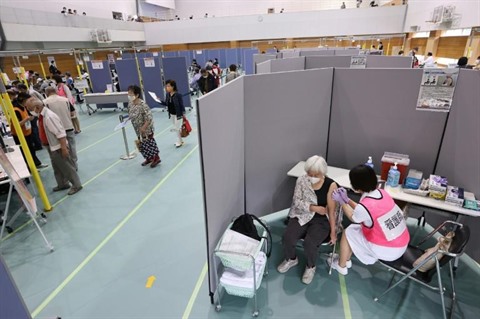 | Un centre de vaccination de masse contre le COVID-19, le 24 mai à Toyoake, au Japon. |