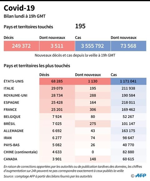| Bilan mondial de la pandémie de nouveau coronavirus, au 4 mai à 19h00 GMT. |