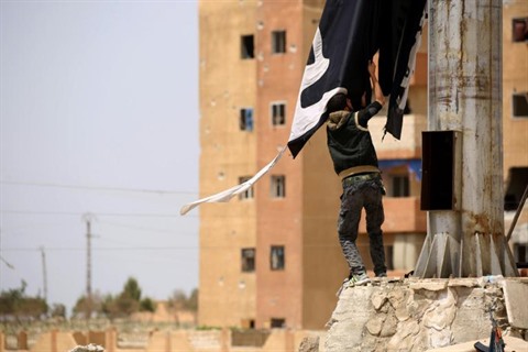 | Un membre des forces démocratiques syriennes enlève un drapeau du groupe d'État islamique dans la ville de Tabqa, à environ 55 km à l'ouest de Raqa, le 30 avril. |