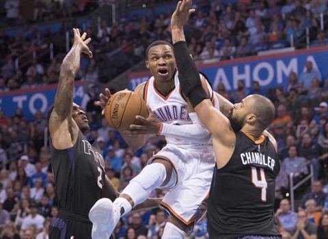 | Le meneur du Thunder d'Oklahoma City, Russel Westbrook (centre), marque deux de ses 51 points face aux Phoenix Suns, le 28 octobre 2016 à Oklahoma City. |