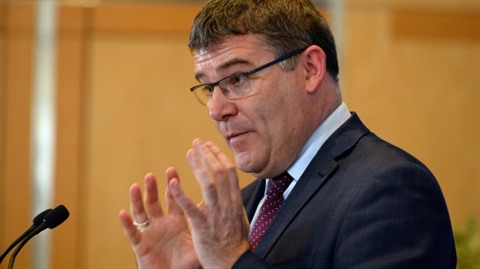 | Le secrétaire d’État à l'Industrie, Christophe Sirugue lors d'une conférence de presse à Paris, le 6 avril 2017. |
