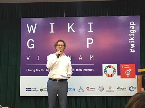 | L’ambassadeur de Suède au Vietnam, Pereric Högberg, prend la parole lors de l’atelier intitulé WikiGap, le 19 octobre à Hanoï. |