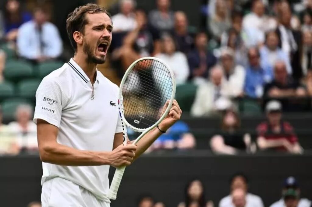 | Le Russe Daniil Medvedev lors de son match contre le Hongrois Marton Fucsovics à Wimbledon, le 8 juillet. |