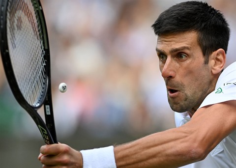 | Le Serbe Novak Djokovic face au Canadien Denis Shapovalov en demi-finale de Wimbledon, le 9 juillet. |