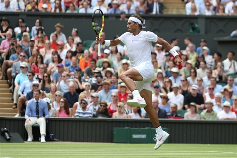 | Rafael Nadal vainqueur du Kazakh Mikhail Kukushkin à Wimbledon, le 5 juillet. |