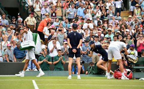 | Le Croate Marin Cilic (gauche) quitte le court, éliminé par l'Argentin Guido Pella à Wimbledon, le 5 juillet. |