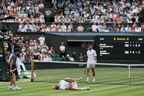 | L'Italien Jannik Sinner à terre après une chute lors de son quart de finale de Wimbledon perdu contre le Serbe Novak Djokovic le 5 juillet. |