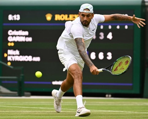 | L'Australien Nick Kyrgios contre le Chilien Cristian Garin en quart de finale de Wimbledon, le 6 juillet. |