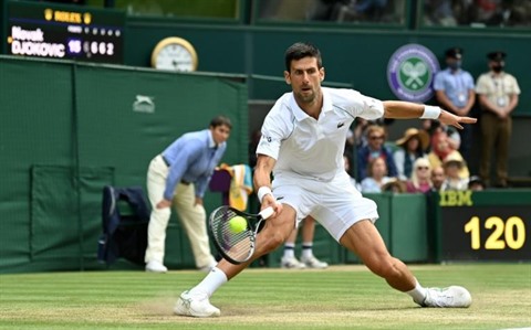 | Le Serbe Novak Djokovic, face à l'Italien Matteo Berrettini, lors de la finale du tournoi de Wimbledon, le 11 juillet à Londres. |