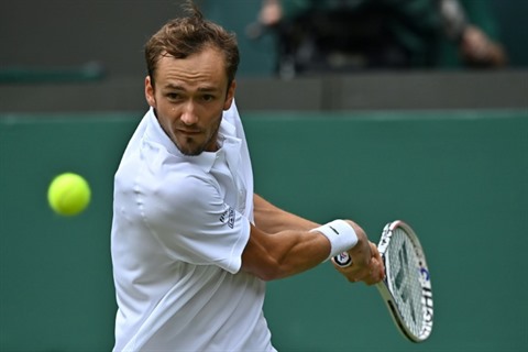 | Le Russe Daniil Medvedev, lors de son match du 2e tour contre l'Espagnol Carlos Alcaraz, le 1er juillet au tournoi de Wimbledon, à Londres. |