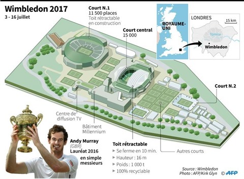 | Stade de tennis sur gazon de Wimbledon (3-16 juillet). |