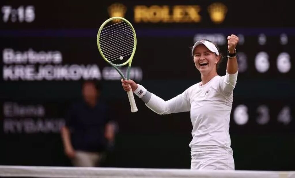 | Barbora Krejcikova savoure son triomphe face à la favorite Elena Rybakina à Wimbledon, le 11 juillet. |