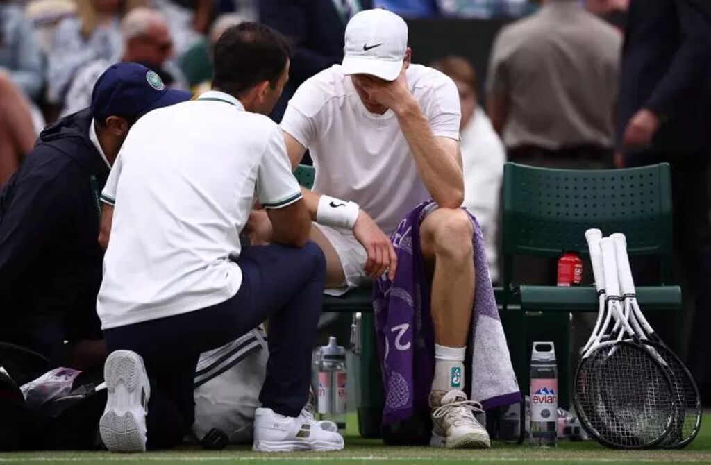 | Jannik Sinner pris en charge par un médecin lors de son match contre Daniil Medvedev à Wimbledon, le 9 juillet. |