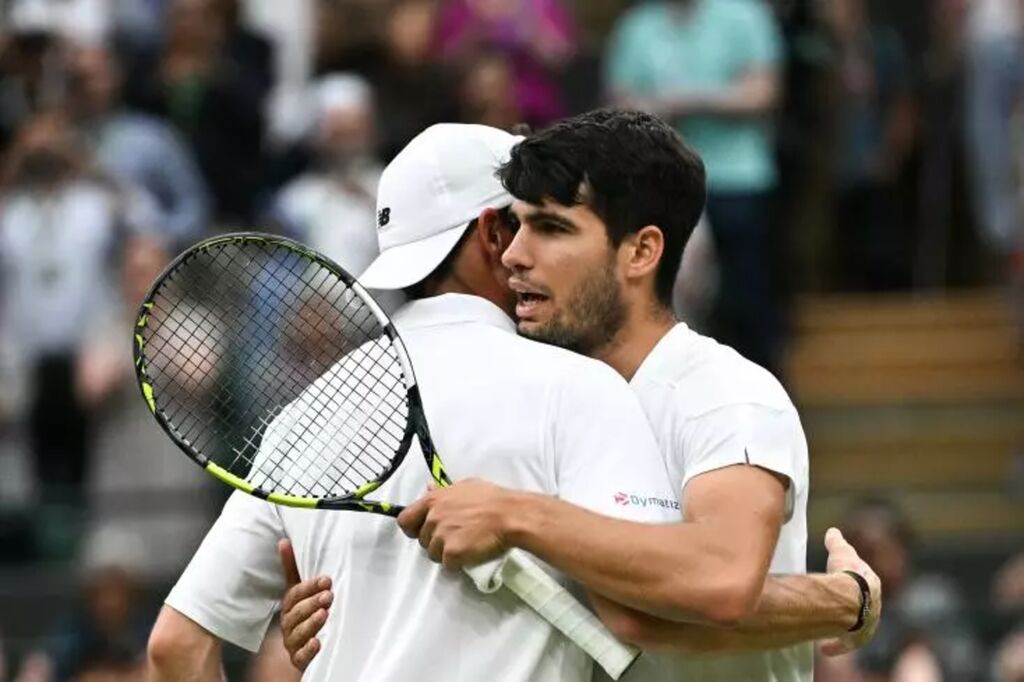 | Accolade entre Carlos Alcaraz (de face) et Tommy Paul à l'issue de leur quart de finale à Wimbledon, le 9 juillet. |