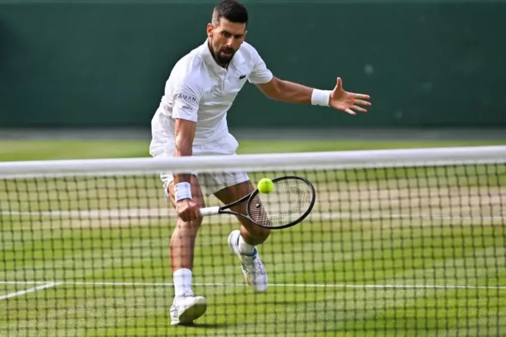 | Le N.6 mondial Novak Djokovic en quarts de finale de Wimbledon contre l'Italien Flavio Cobolli le 9 juillet 2025 à Londres. |
