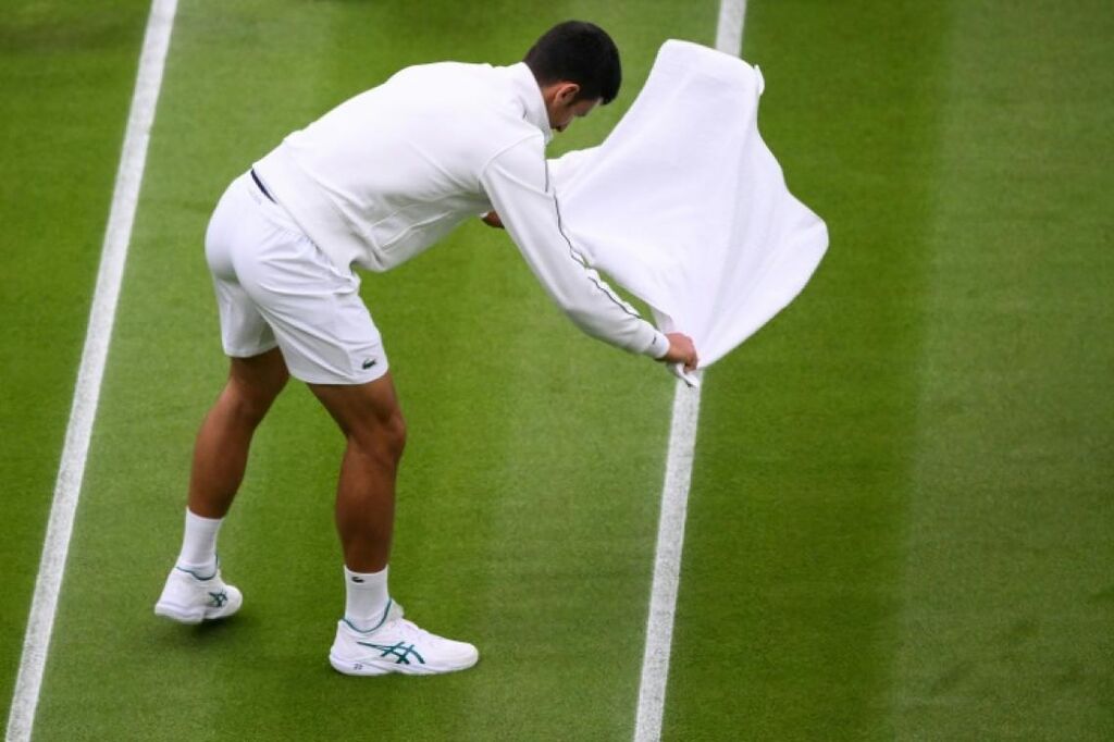 | Novak Djokovic tente de sécher le gazon avec une serviette éponge pendant un arrêt de son match contre Pedro Cachin, le 3 juillet. |