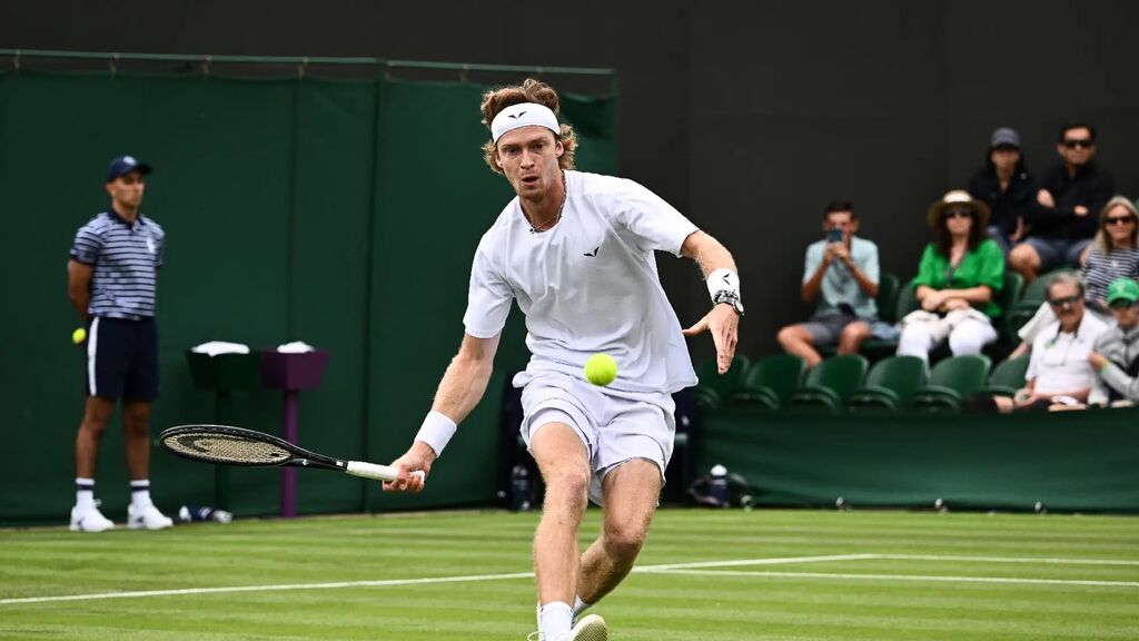 | Le Russe Andrey Rublev contre l'Australien Max Purcell pour son retour à Wimbledon, le 3 juillet. |