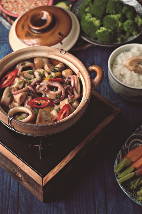 - Dans une petite cocotte en terre cuite, mettre le riz puis les calamars. Les saupoudrer de poivre. Placer la cocotte sur un réchaud à bougie pour garder