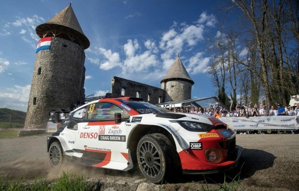 | Le pilote britannique Elfyn Evans et son copilote Scott Martin lors de la 14e spéciale du Rallye de Croatie, dans leur Toyota GR Yaris. |