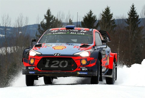 | Le Français Sébastien Loeb (Hyundai i20) lors d'une spéciale du Rallye de Suède, le 15 février 2019 à Karlstad. |