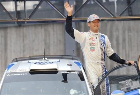 | Le Français Sébastien Ogier salue le public lors du premier jour du rally de Finlande, à Jyvaskyla, le 31 juillet |