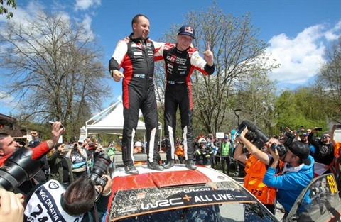 | La joie des Finlandais Kalle Rovanpera (droite) et de son copilote Jonne Halttunen, après avoir remporté sur leur Toyota, le Rallye de Croatie, le 24 avril à Kumrovec, au nord de Zagreb. |
