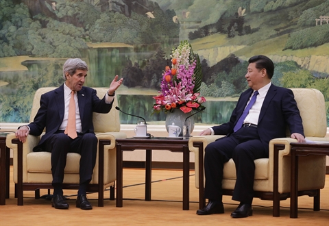 | Le président chinois Xi Jinping (droit) et le secrétaire d'État américain John Kerry, le 27 janvier à Pékin. |